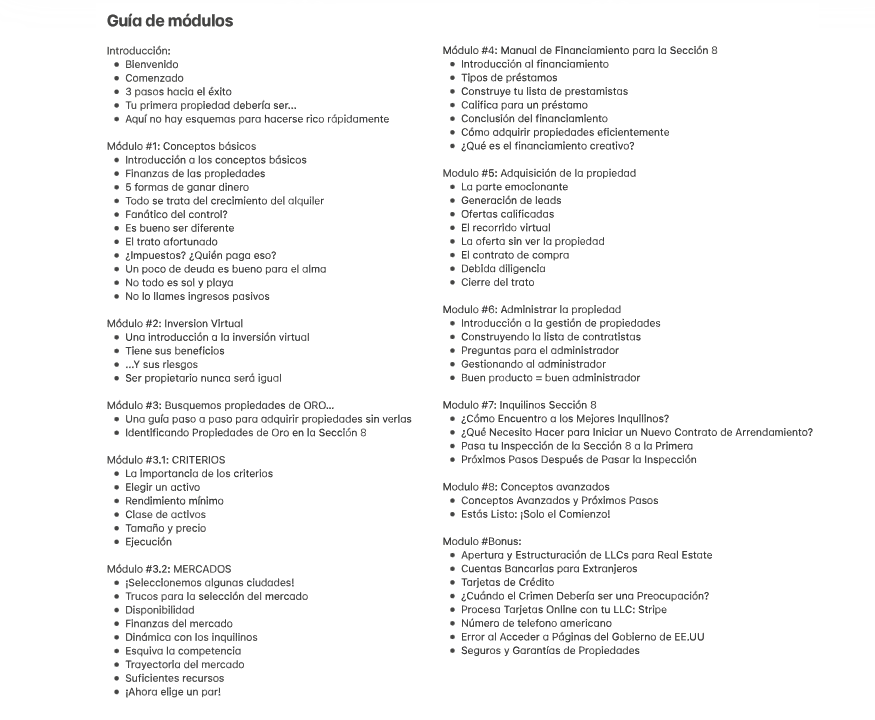 • Mentoría 1-1 con Byron y su equipo para adquirir tus primeras 5 propiedades. • Una comunidad de inversores de la Sección 8. • Acceso vitalicio a promociones, contenido adicional, eventos presenciales y actualizaciones del programa, sin costos adicionales, incluso cuando el precio aumente. • Y cada mes, acceso a una lista privada de propiedades con alto ROI, actualizada mensualmente.